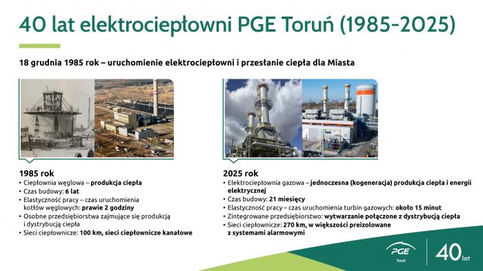 - Przez cztery dekady elektrociepłownia przeszła ogromną transformację – zmieniały się marki, potrzeby odbiorców, wymagania środowiskowe, a wraz z nimi technologie wytwarzania ciepła i energii. Z klasycznej ciepłowni węglowej przekształciliśmy się w nowoczesną elektrociepłownię gazową, działającą w kogeneracji – produkującą jednocześnie ciepło i energię elektryczną. Ta dekarbonizacja była z korzyścią dla mieszkańców, środowiska i systemu ciepłowniczego w Toruniu - podkreśla Wojciech Dobrak, Prezes Zarządu PGE Toruń. - Obecnie, elektrociepłownia jest całkowicie bezodpadowa i emituje o 95% mniej dwutlenku siarki i pyłów ogólnych oraz o połowę mniej tlenków azotu niż przy użyciu paliwa węglowego. Zmieniając technologię wytwarzania zyskaliśmy czystsze powietrze w Toruniu– dodaje prezes Wojciech Dobrak.