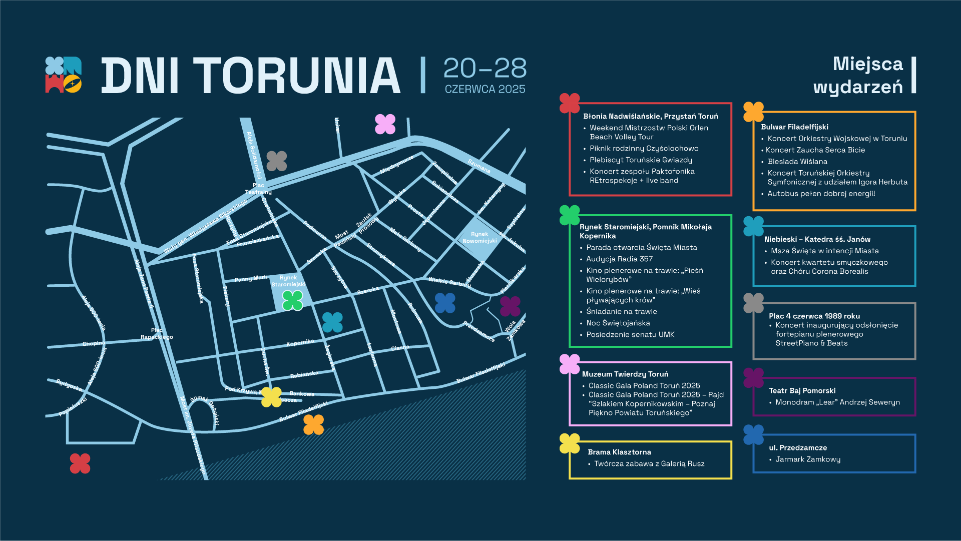 Świętowanie będzie kontynuowane w piątek 27 czerwca - na Błoniach Nadwiślańskich przy Przystani Toruń o godz. 17:00 rozpocznie się 20. jubileuszowa edycja plebiscytu „Toruńskie Gwiazdy”, współorganizowana z radiem GRA. Podczas koncertu zostaną uhonorowani artyści, którzy poprzez swoją działalność i twórczość budują markę miasta, w kategoriach: DJ-a roku, nadzieja roku, płyta i wykonawca roku. W trakcie koncertu usłyszymy laureatów poprzednich edycji (BRYLL i 27.fuckdemons), zespół Manchester, a galę rozdania zakończy o godz. 20:00 występ legendarnego zespołu Paktofonika. Wstęp na koncerty jest bezpłatny.