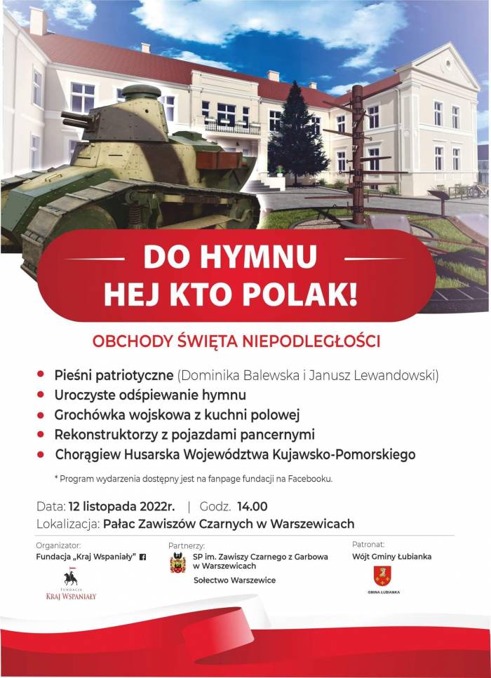 Wydarzenie „Do hymnu - hej kto Polak!” odbędzie się na placu Pałacu Zawiszów Czarnych w Warszewicach od 14:00 do 18:00. Wstęp jest bezpłatny. Patronat nad wydarzeniem objął wójt gminy Łubianka Jerzy Zająkała.