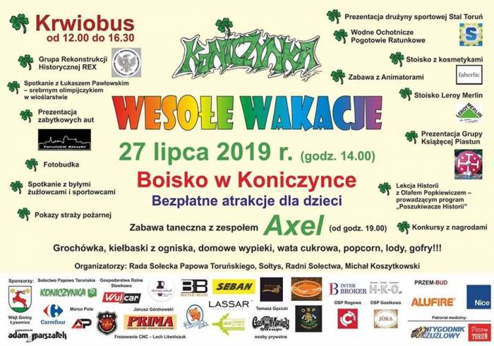 Od godziny 14:00 trwać będzie festyn “Wesołe wakacje” na boisku w Koniczynce. Organizatorzy - sołtys i rada sołecka Papowa Toruńskiego, radni, a także Michał Koszytkowski przygotowali dla mieszkańców niecodzienne atrakcje.