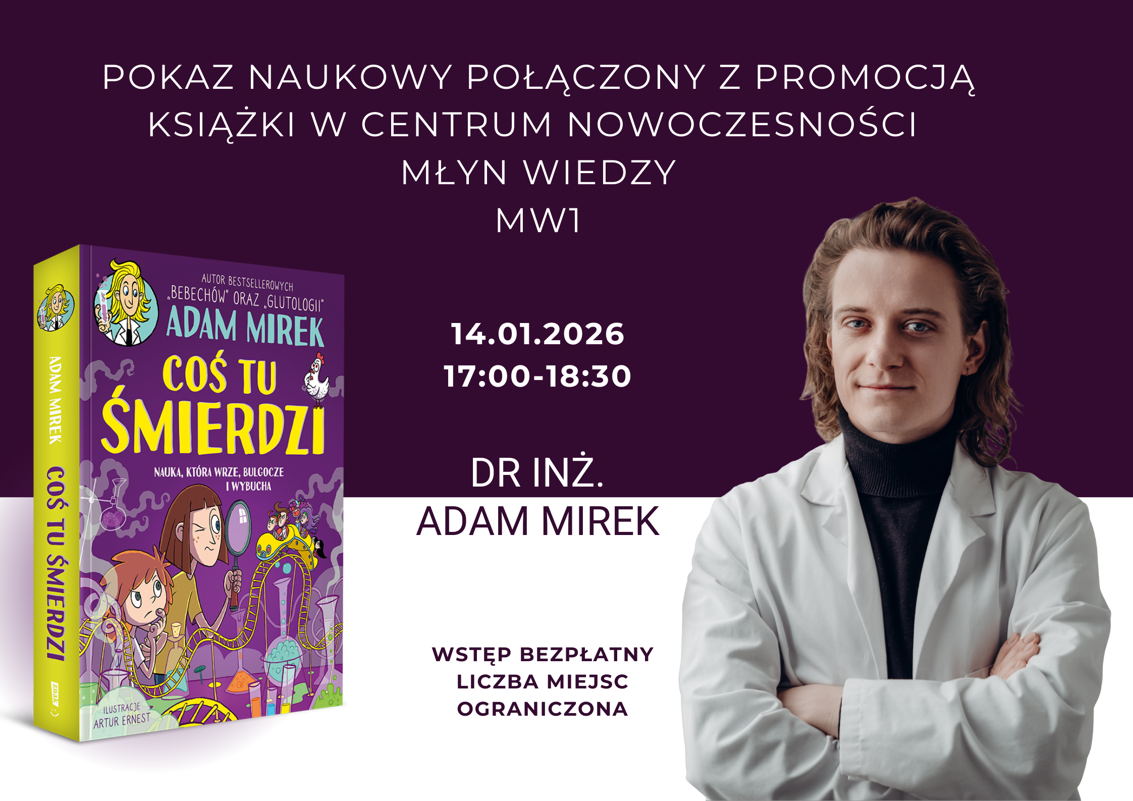 Już 14 stycznia w CNMW odbędzie się pokaz naukowy Adama Mirka oraz spotkanie autorskie dotyczące nowej książki naukowca, a mianowice „Coś tu śmierdzi. Nauka, która wrze, bulgocze i wybucha”.