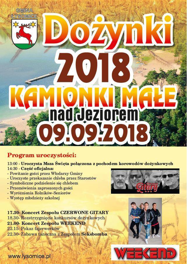 Mowa o dożynkach nad jeziorem w Kamionkach Małych (gmina Łysomice), które odbędą się już w niedzielę 9 września. Uroczystość rozpocznie się o godzinie 13:00 mszą świętą połączoną z tradycyjnym pochodem korowodów dożynkowych. Półtorej godziny później przyjdzie czas na część oficjalną, czyli powitanie gości przez włodarzy gminy, uroczyste przekazanie chleba przez starostów i dzielenie się nim. Następnie w centrum uwagi znajdą się najstarsi i najmłodsi, a to za sprawą wyróżnień dla rolników-seniorów oraz występów uczniów.