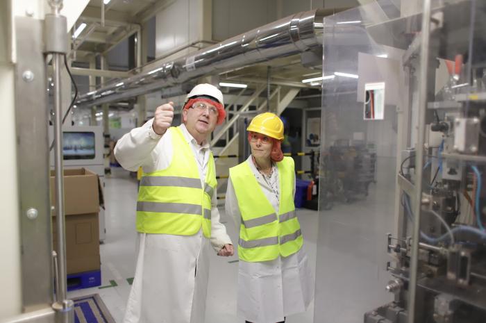 Monika Michniak z dyrektorem fabryki w Lubiczu, Sławomirem Zdrojewskim, na jednej z linii lubickiej fabryki. Fot. Cereal Partners Poland Toruń-Pacific