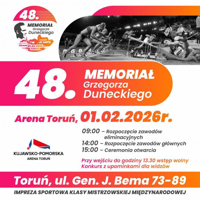 1 lutego w Kujawsko-Pomorskiej Arenie Toruń odbędzie się 48. Memoriał Grzegorza Duneckiego. Łącznie na listach startowych znalazło się 900 zawodniczek i zawodników - w tym czołowi toruńscy zawodnicy Adrian Brzeziński i Anna Matuszewicz. Organizatorem wydarzenia jest MKL Toruń.