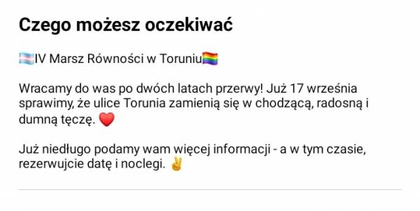 Warto odnotować także, że w mediach społecznościowych powstało już wydarzenie IV Marsz Równości w Toruniu, gdzie systematycznie będą ujawniane kolejne informacje dot. imprezy.