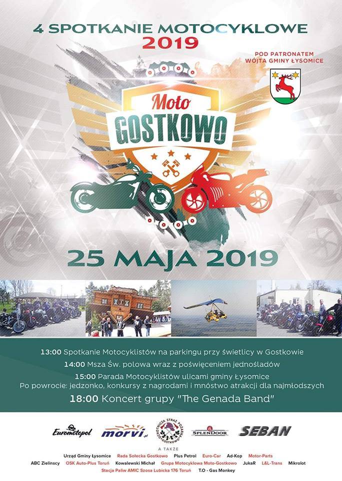 25 maja w Gostkowie odbędzie się “4 Spotkanie Motocyklowe”. W tym roku patronat nad wydarzeniem objął Wójt Gminy Łysomice Piotr Kowal.