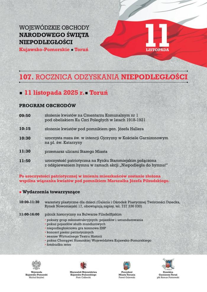 A warto wybrać się do centrum Torunia, bowiem to właśnie tam będzie centrum wydarzeń związanych z obchodami Narodowego Święta Niepodległości. O godzinie 10:30 w kościele garnizonowym pod wezwaniem św. Katarzyny odprawiona zostanie msza święta w intencji ojczyzny. Wcześniej delegacje złożą kwiaty na Cmentarzu Komunalnym pod obeliskiem Ku czci poległych w latach 1918 - 1921 oraz pod pomnikiem gen. Józefa Hallera.