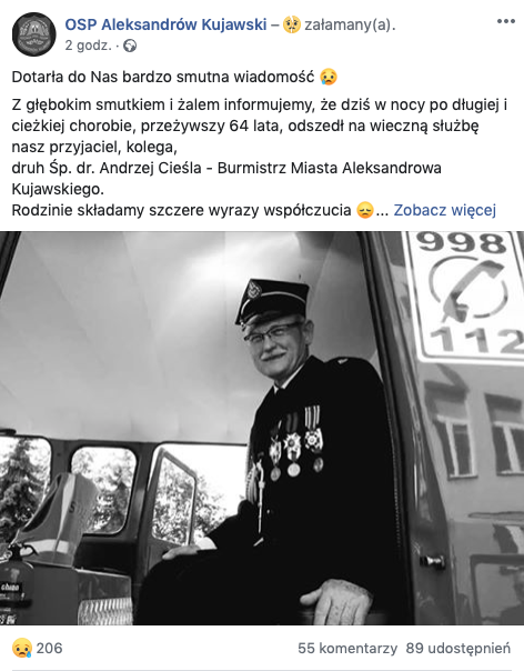 - Z wielkim smutkiem przyjąłem wiadomość o śmierci śp. Andrzeja Cieśli, Burmistrza Aleksandrowa Kujawskiego. Rodzinie, bliskim i współpracownikom Zmarłego składam z serca płynące wyrazy współczucia - napisał na Facebook-u wojewoda kujawsko-pomorski Mikołaj Bogdanowicz. - Odszedł na wieczną służbę nasz przyjaciel, kolega, druh Śp. dr Andrzej Cieśla - to z kolei fragment wpisu strażaków-ochotników z Aleksandrowa Kujawskiego.