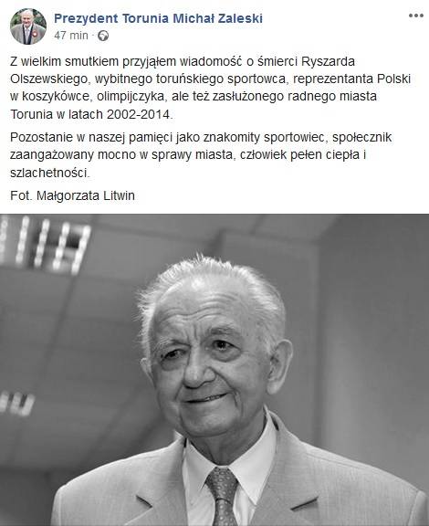 W wieku 87 lat odszedł od nas Ryszard Olszewski, wybitny toruński sportowiec. Taką informację przekazał za pośrednictwem portalu społecznościowego Facebook prezydent Torunia Michał Zaleski. - Z wielkim smutkiem przyjąłem wiadomość o śmierci Ryszarda Olszewskiego [...]. Pozostanie w naszej pamięci jako znakomity sportowiec, społecznik zaangażowany mocno w sprawy miasta, człowiek pełen ciepła i szlachetności - napisał prezydent Zaleski.