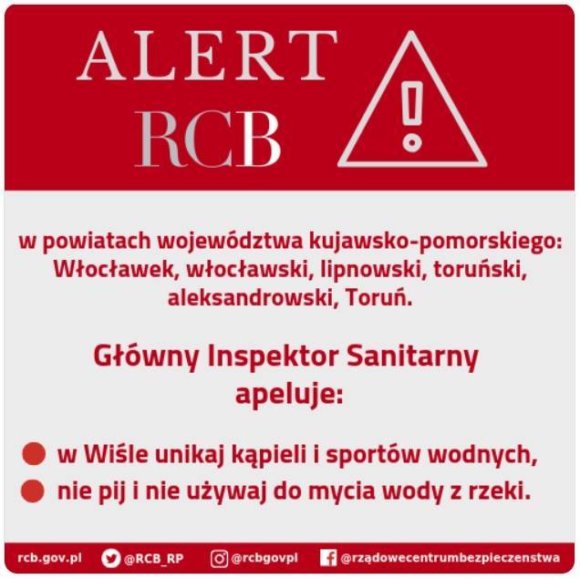 Rządowe Centrum Bezpieczeństwa opublikowało komunikat, w którym apeluje do mieszkańców Torunia i powiatu toruńskiego o unikanie kąpieli i sportów wodnych w Wiśle. Nie należy też pić i używać do mycia wody z rzeki. Przypominamy, że nie ma żadnego zagrożenia dla ujęć wody pitnej w Toruniu.
