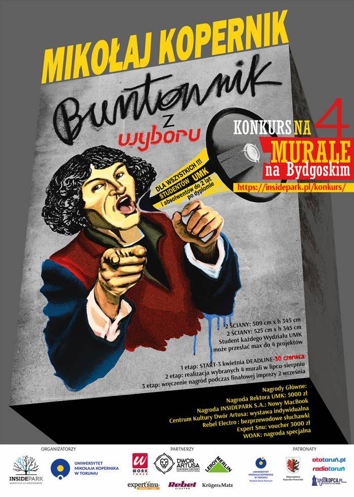 Przed nami bowiem ostatnie dni na zgłaszanie się do niecodziennego wydarzenia, które firma Inside Park ogłosiła w kwietniu. Tylko do piątku (30 czerwca) trwa nabór do konkursu „Mikołaj Kopernik – Buntownik z wyboru”. Studenci i absolwentów wszystkich wydziałów UMK do 2 lat po dyplomie, mogą w ramach tej akcji przedstawić swoją koncepcję na przygotowanie muralu, inspirowanego postawą Mikołaja Kopernika „w kontekście jego buntowniczego podejścia do nauki i związanych z tym konsekwencji, które stały się podstawą do poszerzania wiedzy na temat otaczającego nas świata".