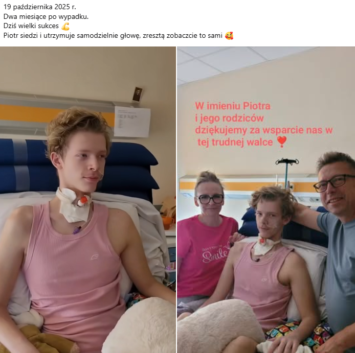 - Każdy dzień w szpitalu to dla mnie walka, ale też nauka cierpliwości i wiary. Dzięki takim chwilom wiem, że nie jestem sam. Wierzę, że z czasem i z pomocą dobrych ludzi uda mi się zrobić kolejne kroki – dosłownie i w przenośni – powiedział Piotrek.