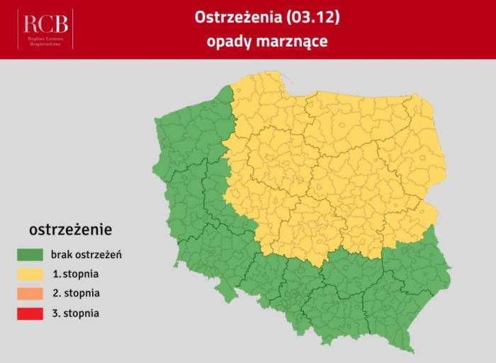 Ważny komunikat Rządowego Centrum Bezpieczeństwa. Dziś (3 grudnia) od godz. 23:00 na terenie Torunia i powiatu toruńskiego ma obowiązywać ostrzeżenie przed opadami marznącego deszczu i mżawką powodującą gołoledź.