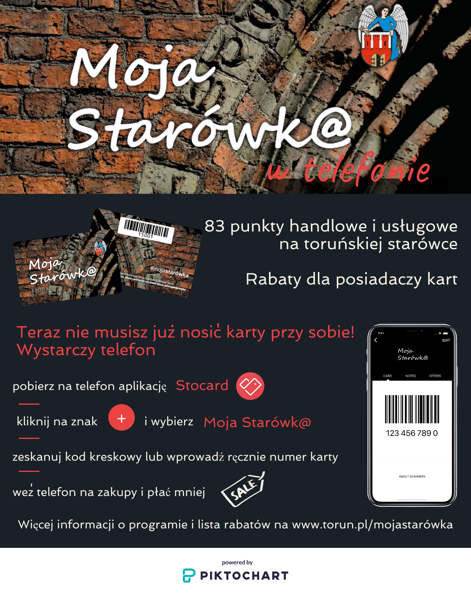 Moja Starówk@ to pomysł na zachęcenie mieszkańców do robienia zakupów i spędzania wolnego czasu na toruńskiej starówce. Dzięki wprowadzeniu nowej aplikacji mobilnej korzystanie z szerokiego wachlarzu usług będzie jeszcze łatwiejsze. - Program lojalnościowy Moja starówk@ to wspólne przedsięwzięcie staromiejskich przedsiębiorców i Gminy Miasta Toruń, koordynowane przez Biuro Toruńskiego Centrum Miasta - informuje Aleksandra Iżycka dyrektor Biura Toruńskiego Centrum Miasta.