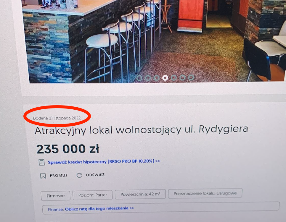 Teraz ogłoszenie znowu trafiło do sieci... Pub jest ponownie na sprzedaż. Cena za ten lokal użytkowy to nadal 235 tysięcy złotych. Właściciel potwierdza, że nieruchomość obecnie jest wykorzystana na potrzeby baru.