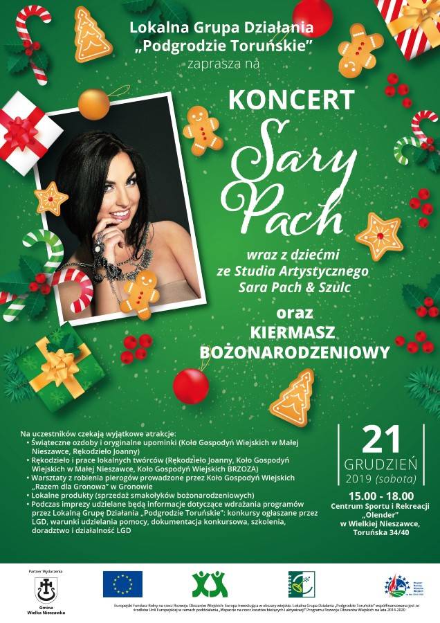 Lokalna Grupa Działania “Podgrodzie Toruńskie”, która działa w gminach: Lubicz, Obrowo i Wielka Nieszawka organizuje wyjątkowe wydarzenie z okazji zbliżających się Świąt Bożego Narodzenia. To koncert Sary Pach, której na scenie będą towarzyszyć dzieci ze Studia Artystycznego Sara Pach&Szulc. Wydarzenie odbędzie się w Centrum Sportu i Rekreacji “Olender” w Wielkiej Nieszawce. Rozpocznie się o godzinie 15:00, a zakończy o 18:00. W ciągu tych trzech godzin niezapomniane emocje i wzruszenia gwarantowane.