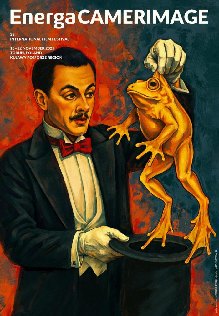 Na plakacie promującym 33. edycję Festiwalu EnergaCAMERIMAGE sztukmistrz wyciąga z kapelusza złotą żabę - symbol Torunia i Międzynarodowego Festiwalu Filmowego EnergaCAMERIMAGE. - Oddajemy hołd magii kina, przywołując zarazem cyrkową aurę świata zachwytów i tajemnic - piszą organizatorzy festiwalu z Fundacji Tumult.