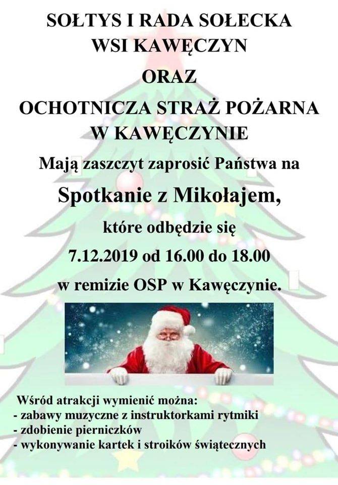 Następnego dnia Święty Mikołaj skorzysta z zaproszenia sołtys, Rady Sołeckiej Wsi Kawęczyn oraz Ochotniczej Straży Pożarnej. Remizę w Kawęczynie odwiedzi w sobotę (7 grudnia). Od godziny 16:00 do 18:00 wszyscy uczestnicy spotkania mają szansę popisać się pomysłowością podczas zdobienia pierniczków, tworzenia kartek i stroików świątecznych, a dzieci powinny doskonale bawić się podczas warsztatów tanecznych z instruktorami rytmiki.