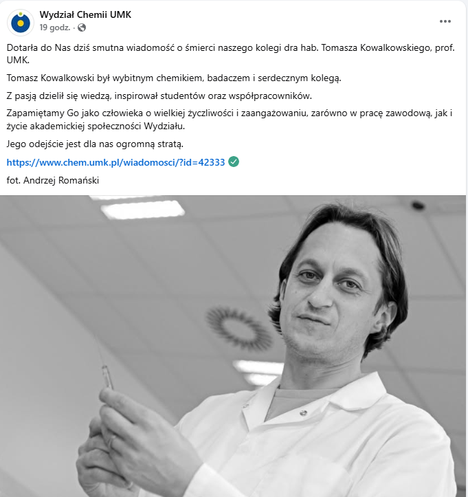 Śmierć prof. Tomasza Kowalkowskiego to ogromna strata dla społeczności Wydziału Chemii UMK w Toruniu. W środę, 20 sierpnia, na profilu Wydziału opublikowano informacje o jego śmierci.