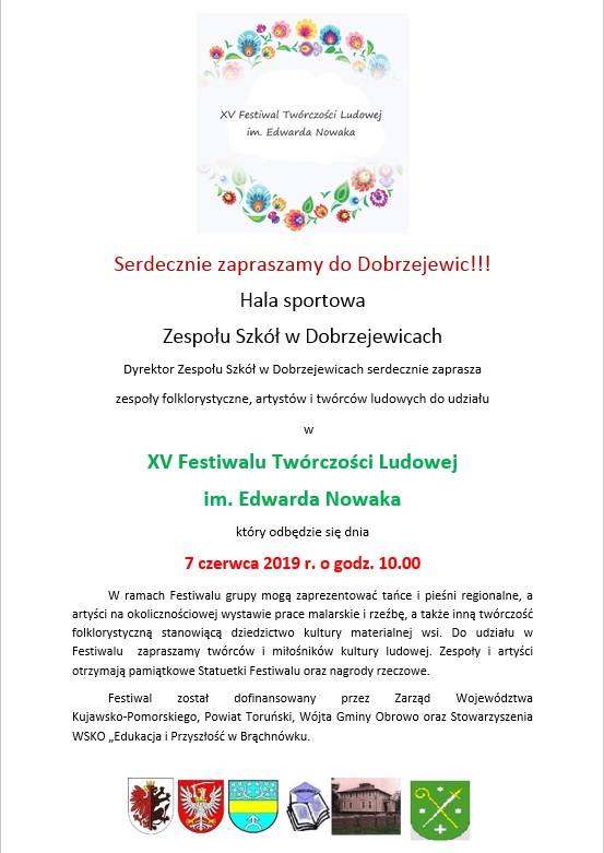 15. edycję Festiwalu Twórczości Ludowej zaplanowano na 7 czerwca 2019. Impreza, która odbędzie się w Zespole Szkół w Dobrzejewicach to święto lokalnej kultury i tradycji.