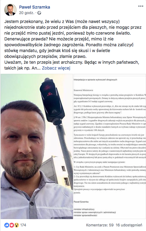 - Jestem przekonany, że wielu z Was (może nawet wszyscy) niejednokrotnie stało przed przejściem dla pieszych, nie mogąc przez nie przejść mimo pustej jezdni, ponieważ było czerwone światło. Denerwujące prawda? Nie możecie przejść, mimo iż nie spowodowalibyście żadnego zagrożenia. Ponadto można zaliczyć stówkę mandatu, gdy jednak ktoś się skusi i w świetle obowiązujących przepisów, złamie prawo. Uważam, że ten przepis jest archaiczny. Będąc w innych państwach, takich jak np. Anglia, mandat nam nie grozi. Czerwone światło jest dla nas ostrzeżeniem, a nie zakazem - mówi Paweł Szramka.