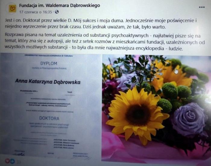 – Jest i on. Doktorat przez wielkie D. Mój sukces i moja duma. Jednocześnie moje poświęcenie i niejedno wyrzeczenie przez brak czasu. Dziś jednak uważam, że było warto – chwaliła się prawie rok temu na profilu Fundacji im. Waldemara Dąbrowskiego.
