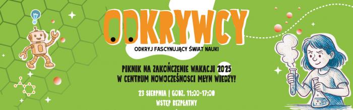 Centrum Nowoczesności Młyn Wiedzy zaprasza na piknik „Odkrywcy”. Wydarzenie odbędzie się w sobotę (23 sierpnia) w godzinach od 11:00 do 17:00. Na parkingu przed budynkiem MW 1 pojawią się stanowiska popularnonaukowe oraz atrakcje dla całych rodzin. - To propozycje, które łączą naukę z zabawą i pobudzają ciekawość - idealne dla małych i dużych odkrywców! - zachęca organizator.