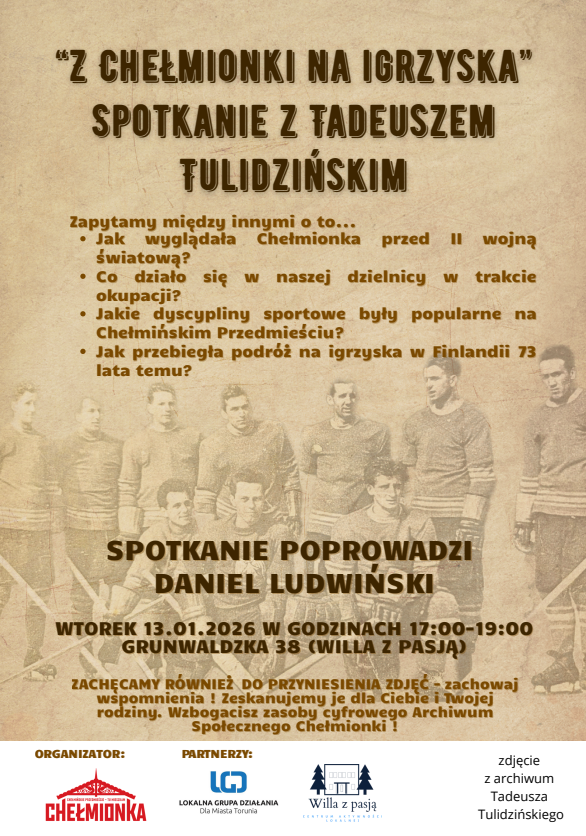 Archiwum Społeczne Chełmionki zaprasza na wyjątkowe spotkanie z Tadeuszem Tulidzińskim – najstarszym toruńskim olimpijczykiem, który w 1952 roku reprezentował Polskę na igrzyskach w Helsinkach jako zawodnik hokeja na trawie. Pan Tadeusz od urodzenia mieszka na Chełmińskim Przedmieściu i jest jednym z najcenniejszych świadków historii tej części miasta.