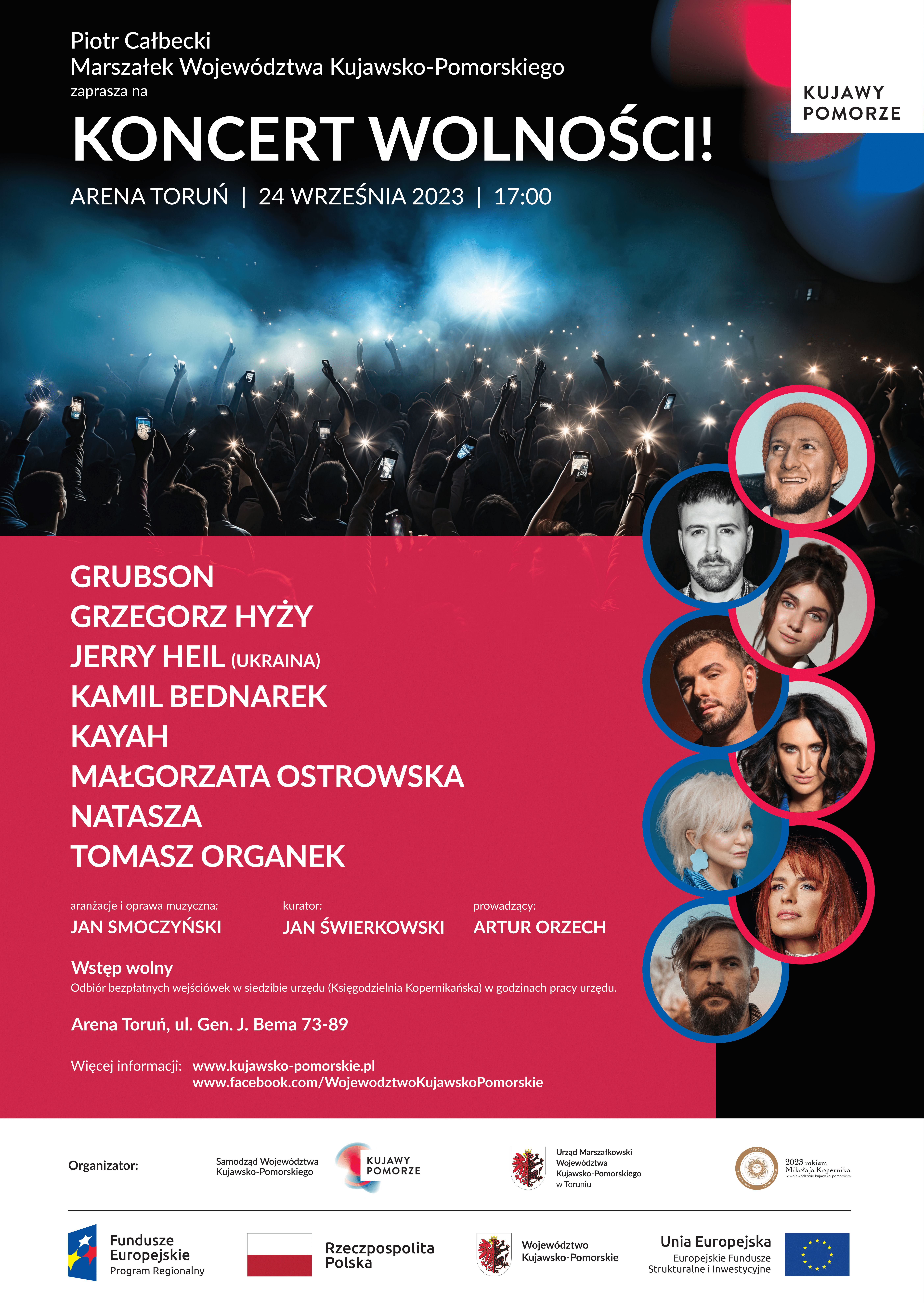 Wydarzenie dofinansowano z Funduszy Europejskich. Na scenie, w wyjątkowej oprawie muzycznej i wizualnej, wystąpią najpopularniejsi polscy artyści i artystki: Kayah, Małgorzata Ostrowska, Natasza, Kamil Bednarek, Tomasz Organek, Grzegorz Hyży oraz Grubson.