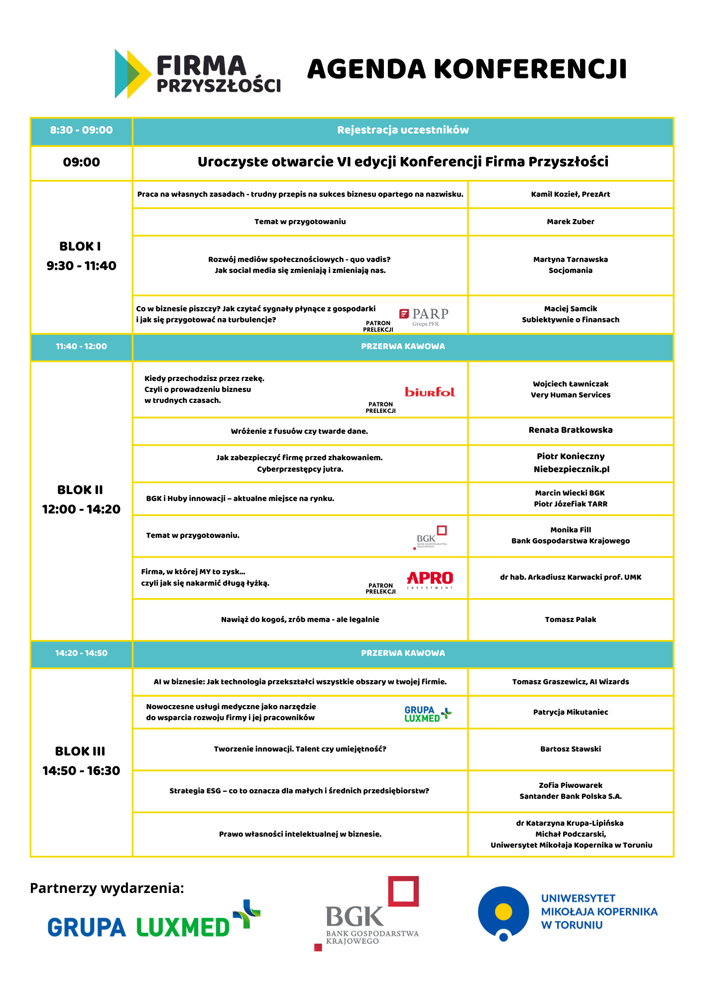 Wyzwania dla biznesu, optymalizacja, nowe technologie, sztuczna inteligencja, odpowiedzialność społeczna, rachunek ekonomiczny. Te wszystkie elementy będą kluczowe dla funkcjonowania firm w najbliższych latach. Główne tematy obejmują: innowacje, nowoczesne technologie, zrównoważony rozwój biznesu, prawo, ekonomię czy marketing. Podczas szóstej edycji konferencji Firma Przyszłości w Toruniu na ten temat wypowiedzą się praktycy i cenieni eksperci. Program wydarzenia znajdziecie na poniższej grafice. Przedstawiamy też krótką sylwetkę niektórych prelegentów.