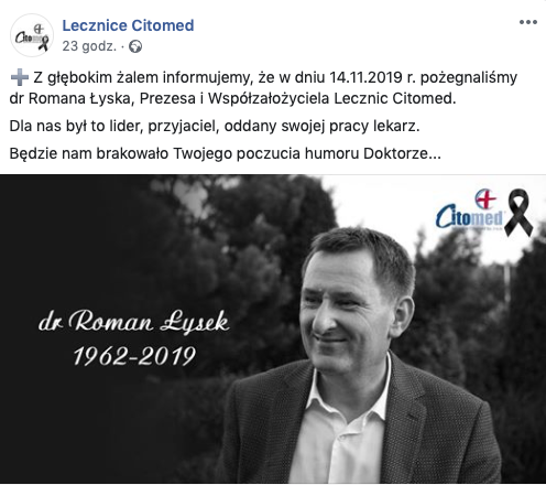 Nadeszła do nas smutna informacja. Nie żyje dr Roman Łysek, prezes i współzałożyciel lecznic Citomed.