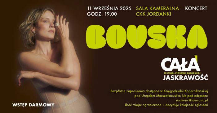 Piosenkarka już 11 września o godz. 19:00 wystąpi w sali kameralnej CKK Jordanki. Koncert jest częścią Festiwalu Piosenki Autorskiej Cała Jaskrawość. Co ważne, na wydarzenie obowiązują darmowe wejściówki, dostępne w Księgodzielni Kopernikańskiej pod Urzędem Marszałkowskim lub pod adresem e-mail: sosmusic@sosmusic.pl.