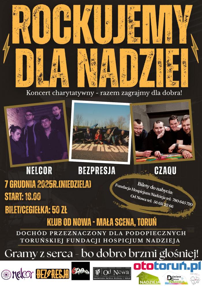 7 grudnia o godzinie 18:00 w toruńskim klubie Od Nowa odbędzie się niezwykłe wydarzenie muzyczne – Rockujemy dla Nadziei, koncert pełen rockowej energii, wzruszeń, dobrej muzyki i jeszcze większego dobra, które wraca do potrzebujących.