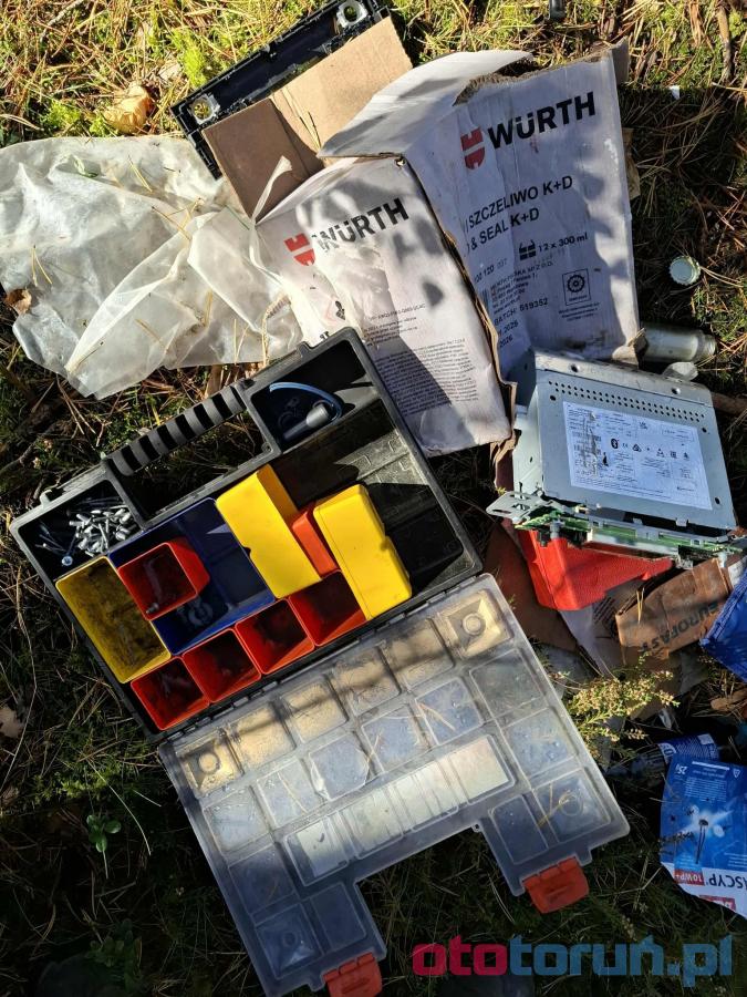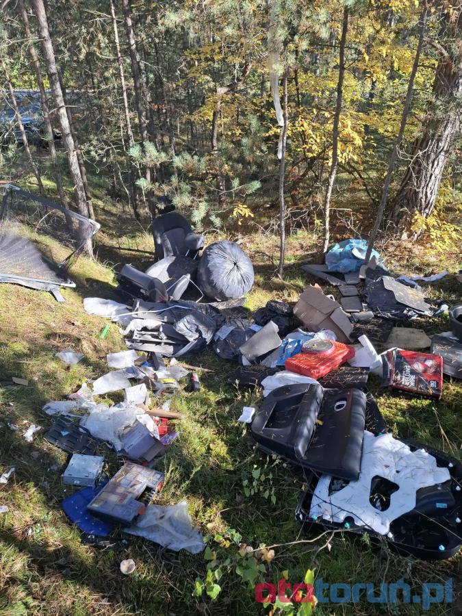 Zdjęcia przedstawiają bałagan w lesie pod Toruniem spowodowany wyrzucaniem odpadów przez nieodpowiedzialną osobę. Na terenie między Czernikowem a Bobrownikami znaleziono białe kartki z markami samochodów i piłkarską bramkę dla dzieci. Leśnicy apelują o pomoc w namierzeniu sprawcy, przypominając, że las nie jest miejscem na śmieci. Za zaśmiecanie grozi kara. Pomóżmy zadbać o nasze środowisko!