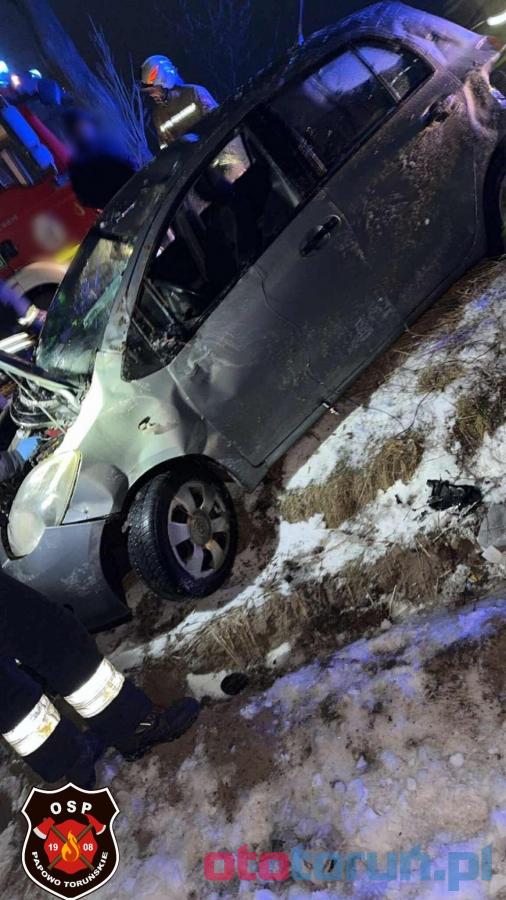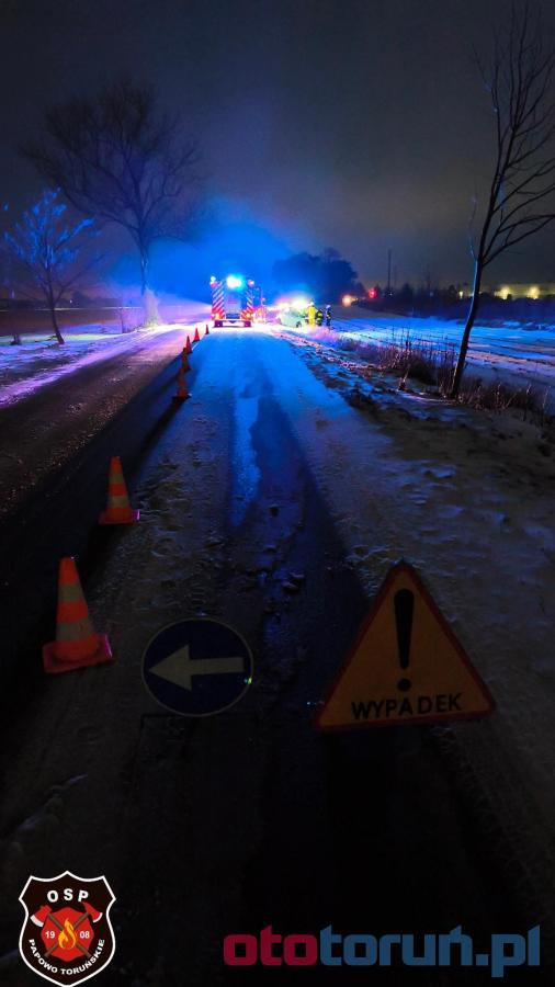 Galeria zdjęć ukazująca wypadek drogowy pod Toruniem, który miał miejsce między Ostaszewem a Łysomicami. Na fotografii widać zniszczone auto, błoto pośniegowe na jezdni oraz działania straży pożarnej i policji. Wypadek zakończył się poszkodowaniem jednej osoby, która na szczęście nie odniosła poważnych obrażeń. Fotografie ilustrują trudne warunki drogowe oraz apel o ostrożną jazdę w zimie. Oto kolejny przykład, jak ważne jest zachowanie szczególnej uwagi za kierownicą, zwłaszcza gdy panują trudne warunki atmosferyczne.