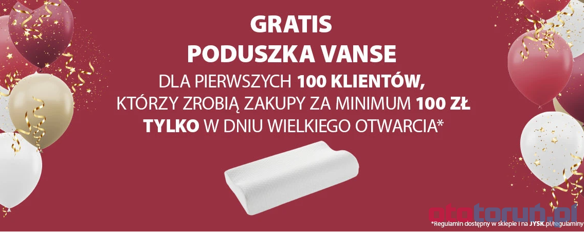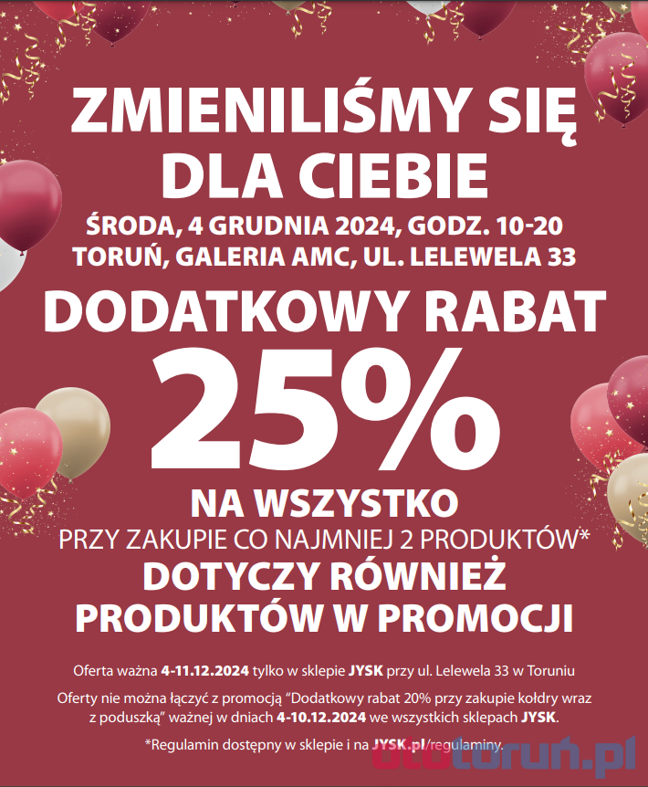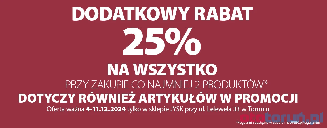 Duńska sieć marketów JYSK powraca do Galerii Wnętrz AMC w Toruniu w nowym wydaniu. Po modernizacji sklep prezentuje się w koncepcji 3.0, oferując wygodną nawigację i inspirujące wnętrza. Asortyment sklepu obejmuje artykuły do sypialni, dekoracje, meble i więcej, utrzymane w stylu skandynawskim. Specjalna oferta promocyjna z 25% rabatem na zakup co najmniej dwóch produktów. Otwarcie o godz. 10:00, codzienne godziny otwarcia od 10:00 do 20:00. JYSK to międzynarodowa sieć handlowa o skandynawskich korzeniach, obecna w ponad 48 krajach.