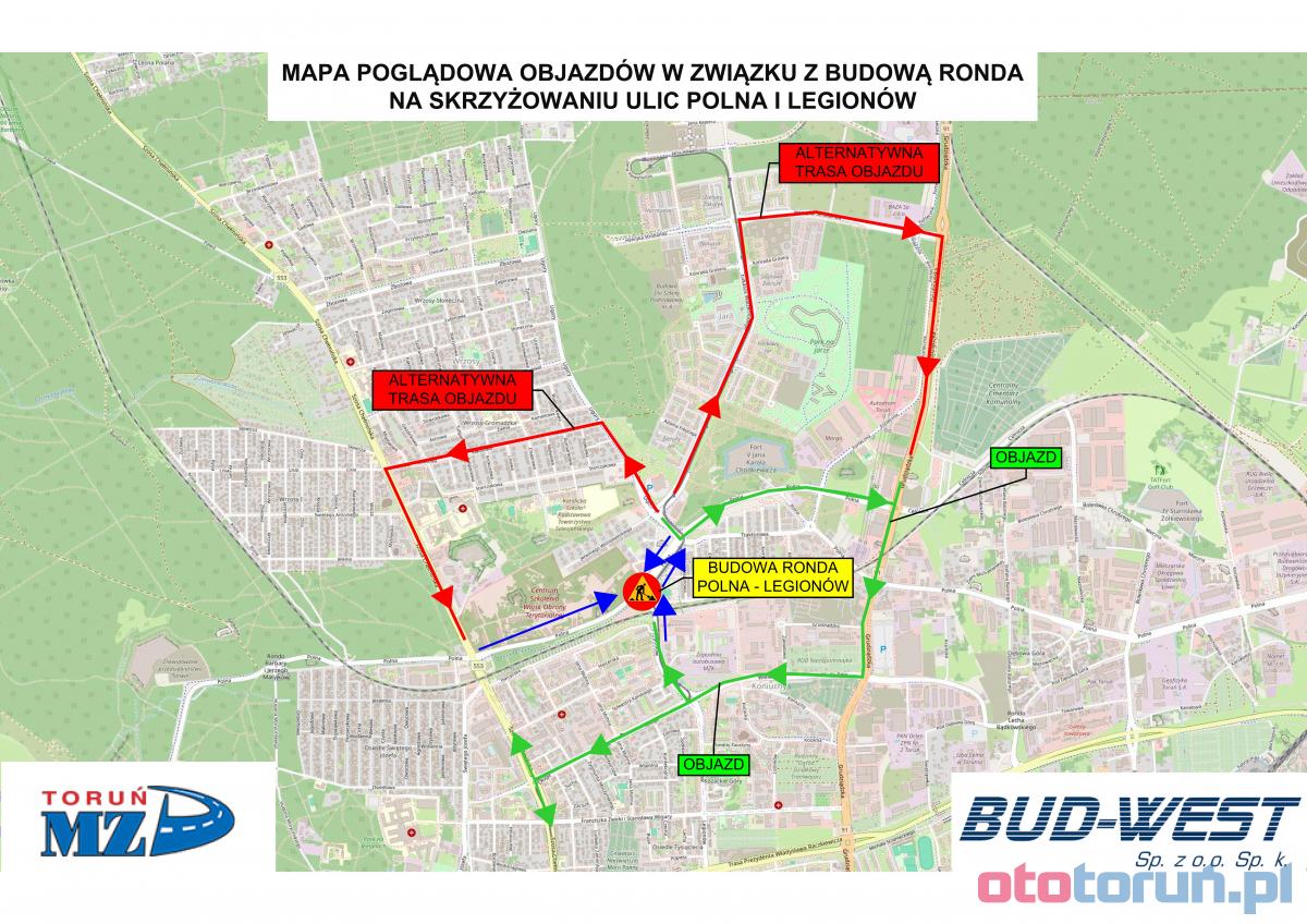 Przebudowa skrzyżowania ulic Polna i Legionów w Toruniu jest już w trakcie. Wkrótce powstanie nowe rondo, które usprawni ruch drogowy w tym miejscu. Inwestycja to część programu poprawy bezpieczeństwa pieszych i rowerzystów. Prace ruszą 18 sierpnia i potrwają do listopada. Po zakończeniu rondo będzie miało trzy wloty, nowe oświetlenie LED oraz średnicę 30 metrów. Całkowity koszt budowy przekroczy 2,5 mln zł.