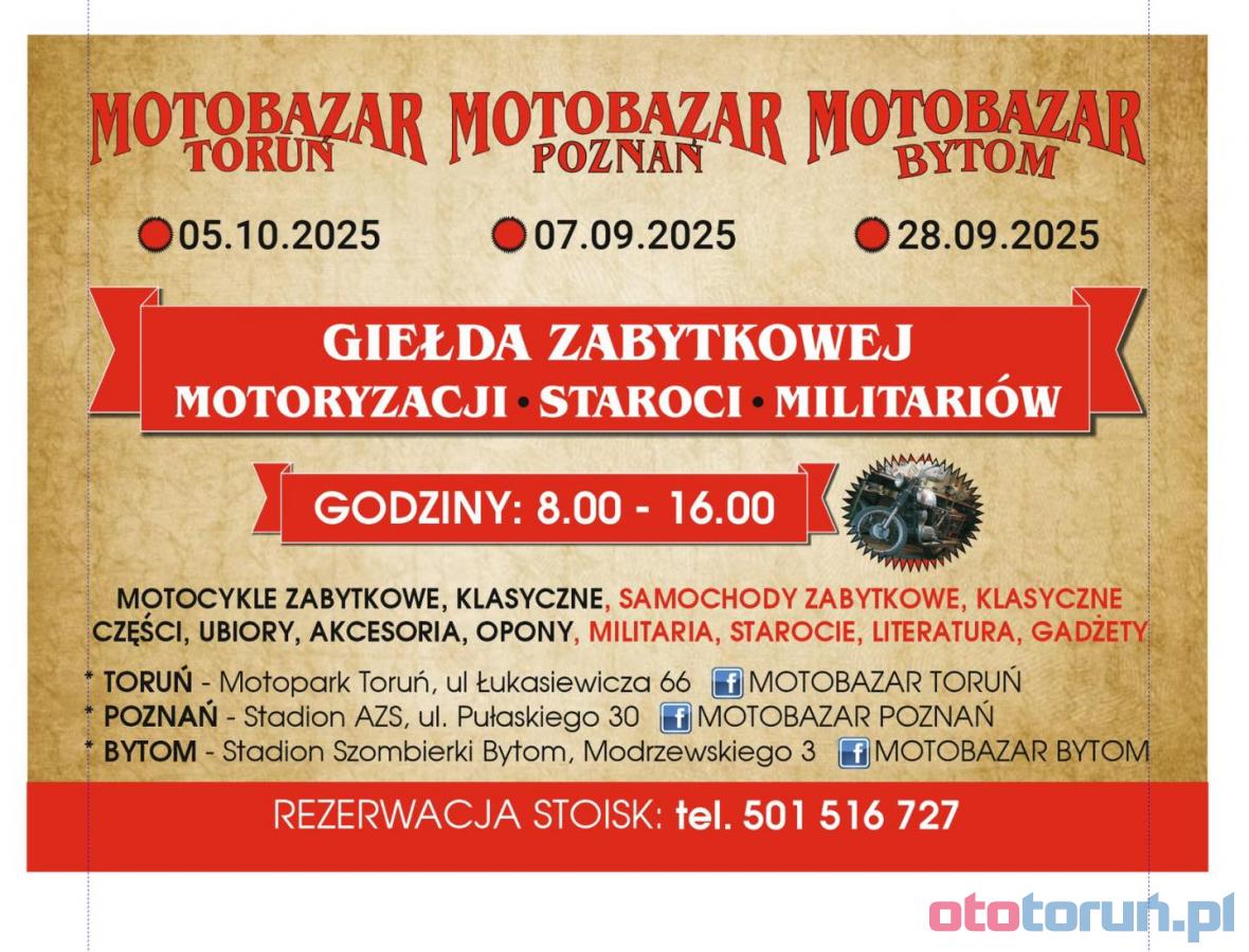 Moto Bazar - klasyczna motoryzacja w okryciach jesieni w Toruniu. Święto dla miłośników zabytkowych pojazdów i dawnej techniki. Wydarzenie rozpoczyna się o 8:00 w Moto Parku, z możliwością zakupu klasycznych pojazdów, części, militariów i akcesoriów. Pokazy aut, punkty gastronomiczne i wygodny parking czekają na gości. Dla dzieci do 12 lat wstęp darmowy. Nie przegap!