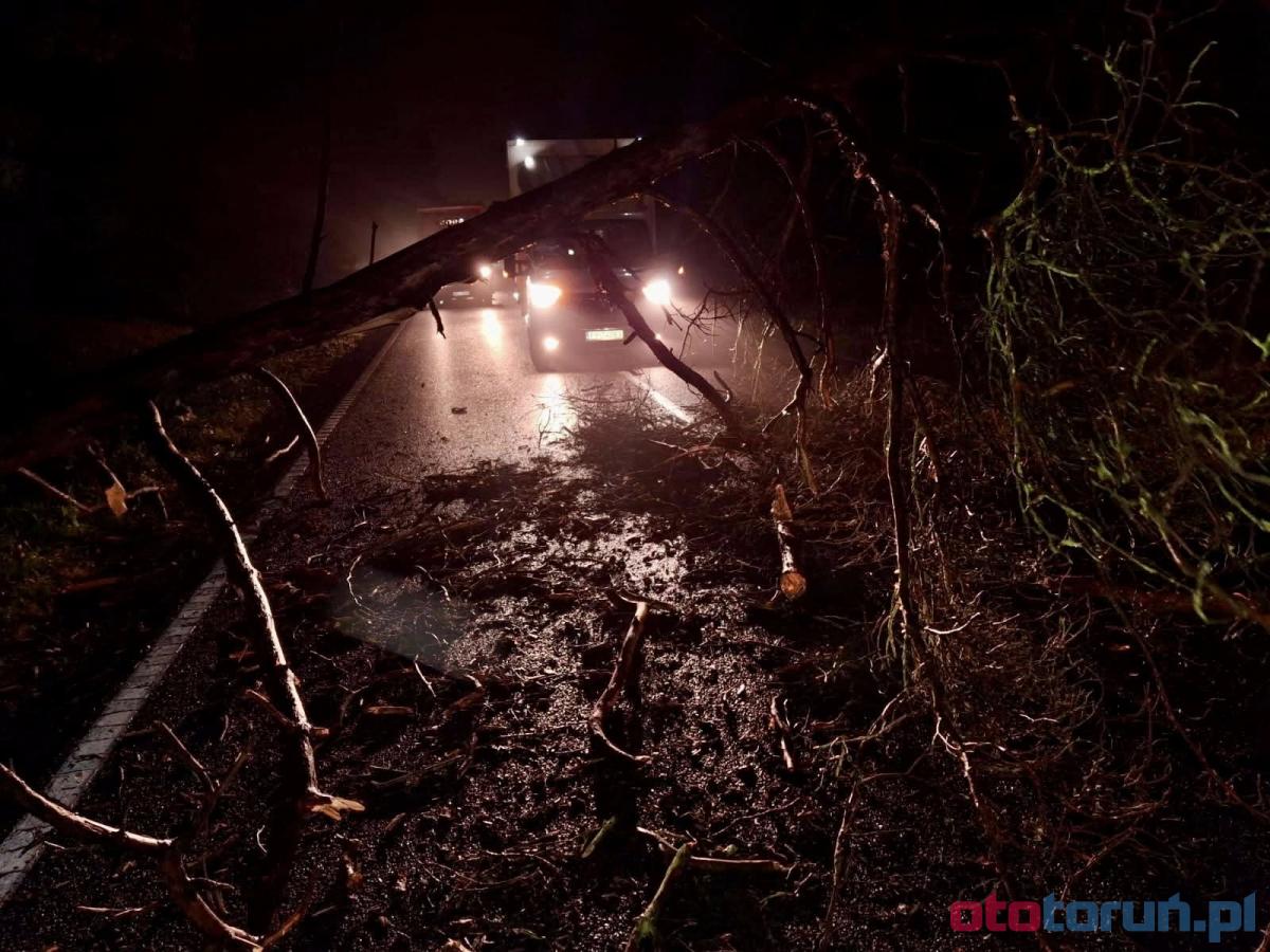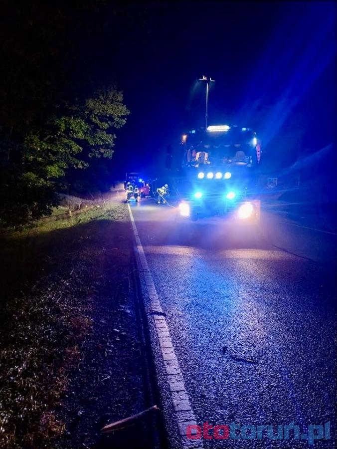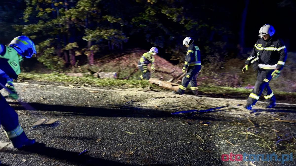 Galeria zdjęć: Mocno uszkodzony samochód po uderzeniu drzewa na drodze krajowej nr 10 W nocy z wtorku na środę doszło do dramatycznego wypadku na odcinku Toruń-Bydgoszcz. Drzewo spadło na auto, blokując przejazd w Makowiskach. Dzięki interwencji strażaków z Solca Kujawskiego nikomu nic się nie stało, ale ruch był paraliżowany. Miejscowi ostrzegają przed niebezpieczeństwem na drodze śmierci - DK10. Po incydencie zalecają uważność także ze względu na dzikie zwierzęta, które mogą krzyżować autostradę. Zdjęcia oddają kiepskie warunki panujące na drodze podczas interwencji służb.