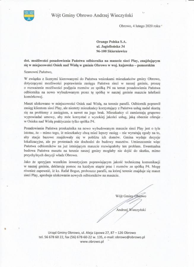 Wójt gminy Obrowo pisze list do Orange i T-Mobile. „Mieszkańcy zamierzają wypowiadać umowy”