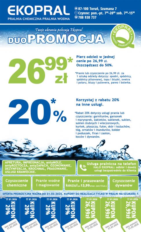Wystarczy wydrukować i przyjść z kuponami do pralni Ekopral na ul. Leona Szumana 7 w Toruniu. Kupony promocyjne ważne są do 31.03.2026 r.. Wydrukowane kupony prosimy okazać personelowi pralni przed zleceniem usługi. Jesteśmy otwarci od poniedziałku do piątku w godzinach 7.00 - 20.00 a w soboty 7.00 - 15.00. Serdecznie zapraszamy.